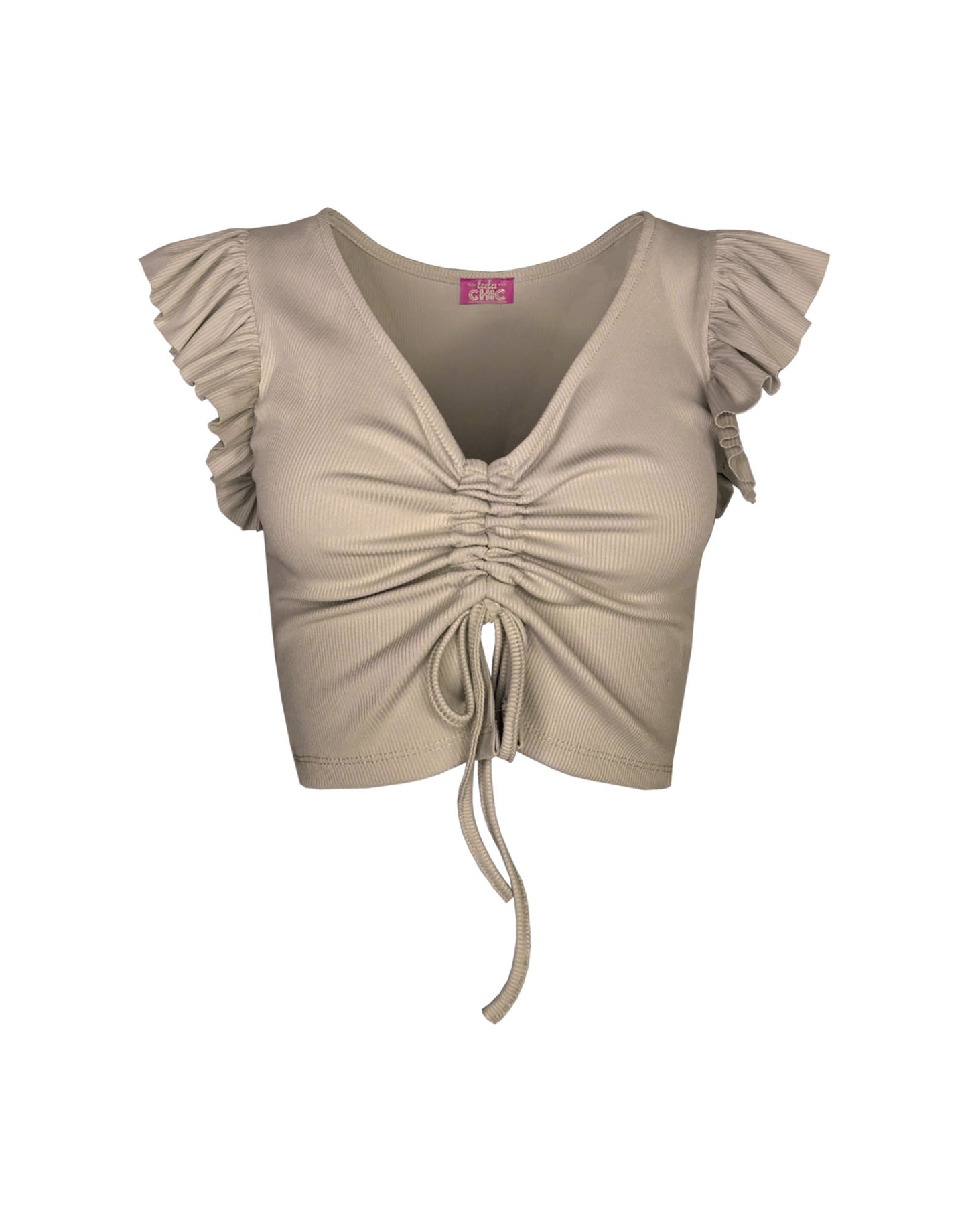 Crafted from soft ribbed-knit fabric, this taupe crop top features a body-hugging tank style with a sexy V-neck, drawstring front, and adorable ruffle detailing on the shoulders. It's a versatile and essential piece for any wardrobe. Slim fit, sleeveless, 92% polyester, 8% elastane. Limited quantity available.