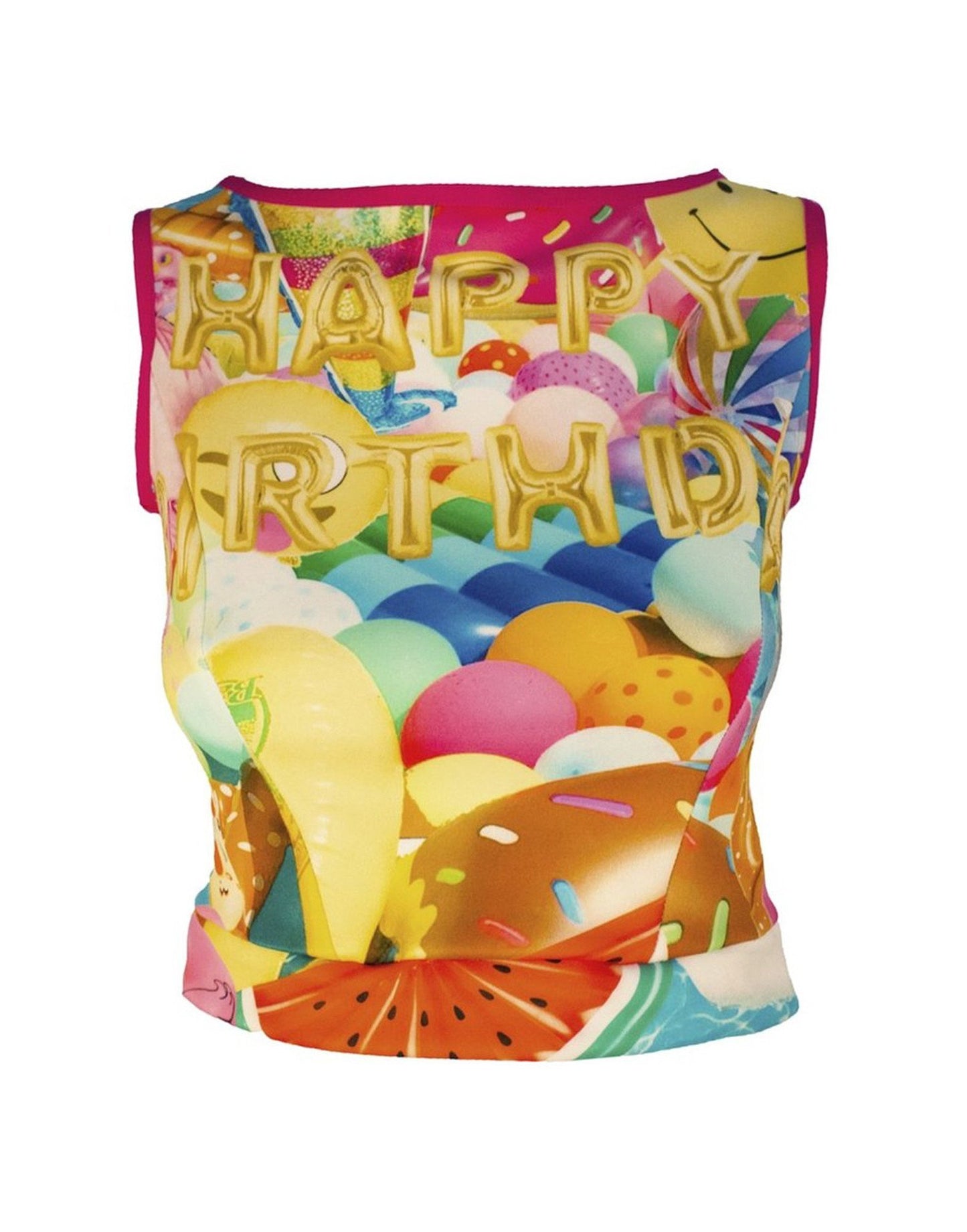 Rock our original top in the funky 'Happy B-day' print. The fabric stretches and (perfect for dancing all night) and it's also available in our "Marble" print. You'll be the life of the party, and the most stylish one at that!