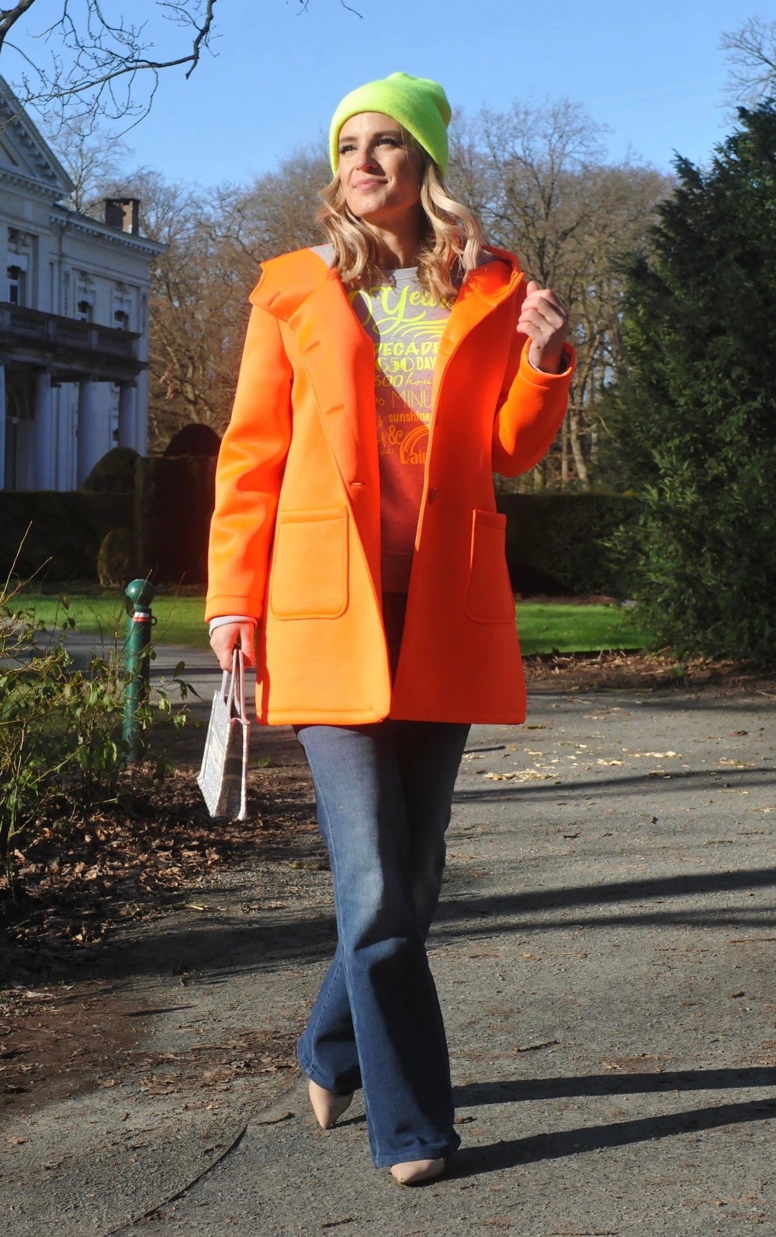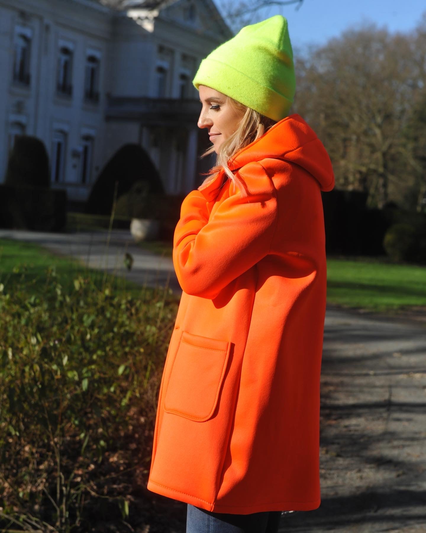 Our Neo hooded coat has a classic silhouette with big pockets, in a modern neoprene fabric.The bright color will pair beautifully with your favourite looks from the collection.