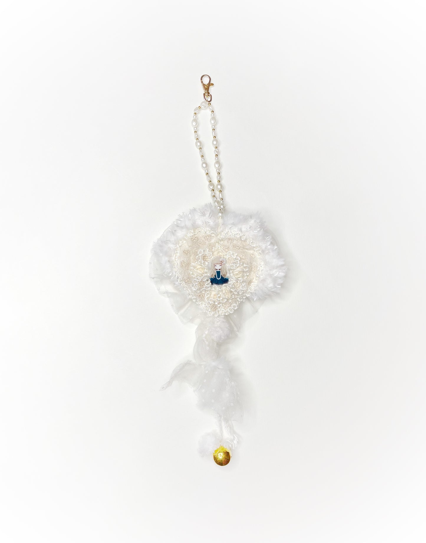 A vision of timeless elegance and delicate charm, the ANGELIQUE WHIMSY Heart Bag Charm brings a touch of vintage beauty to your accessories. A hand-knitted white heart is adorned with a pearl and gold beaded chain loop, exuding sophistication.
