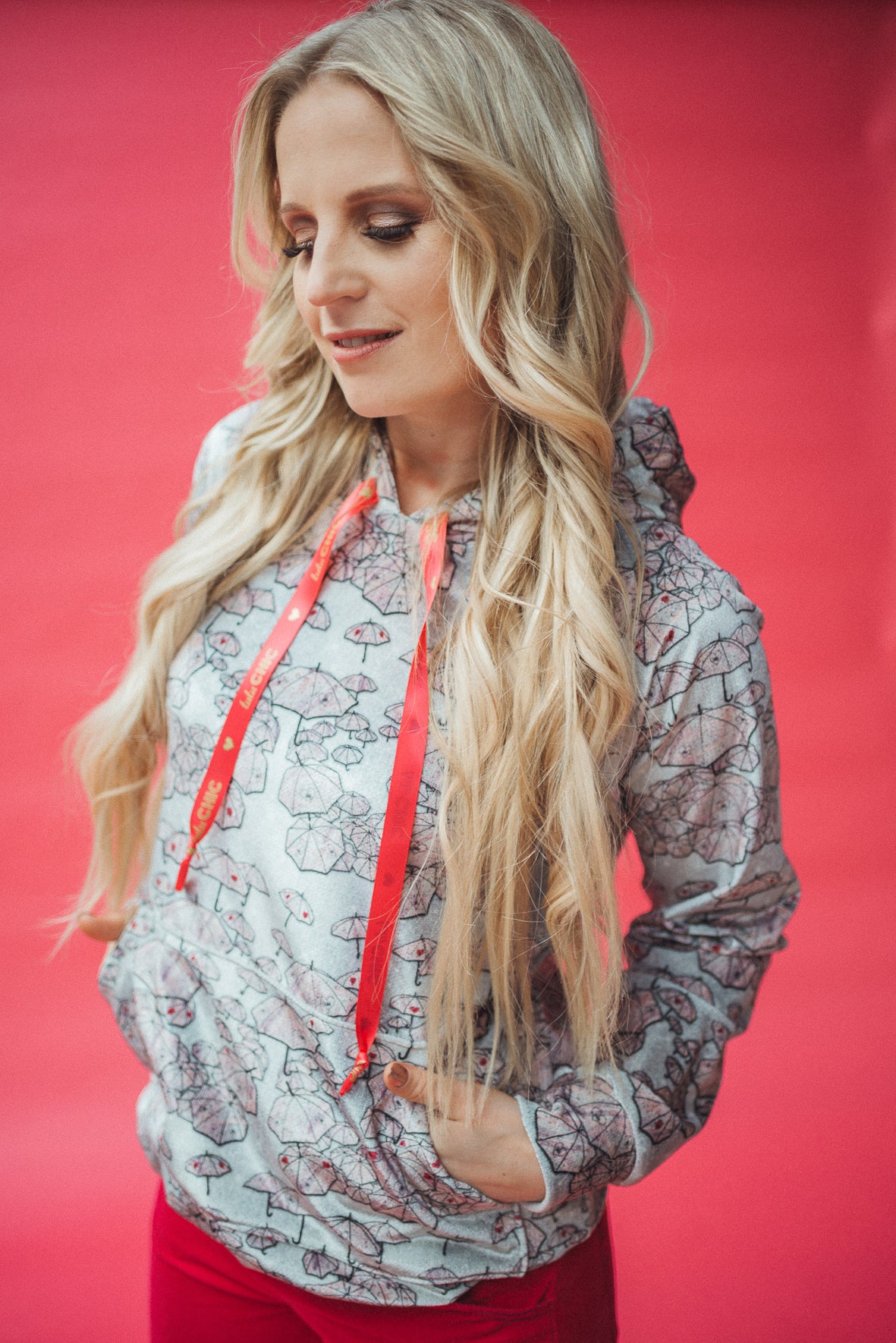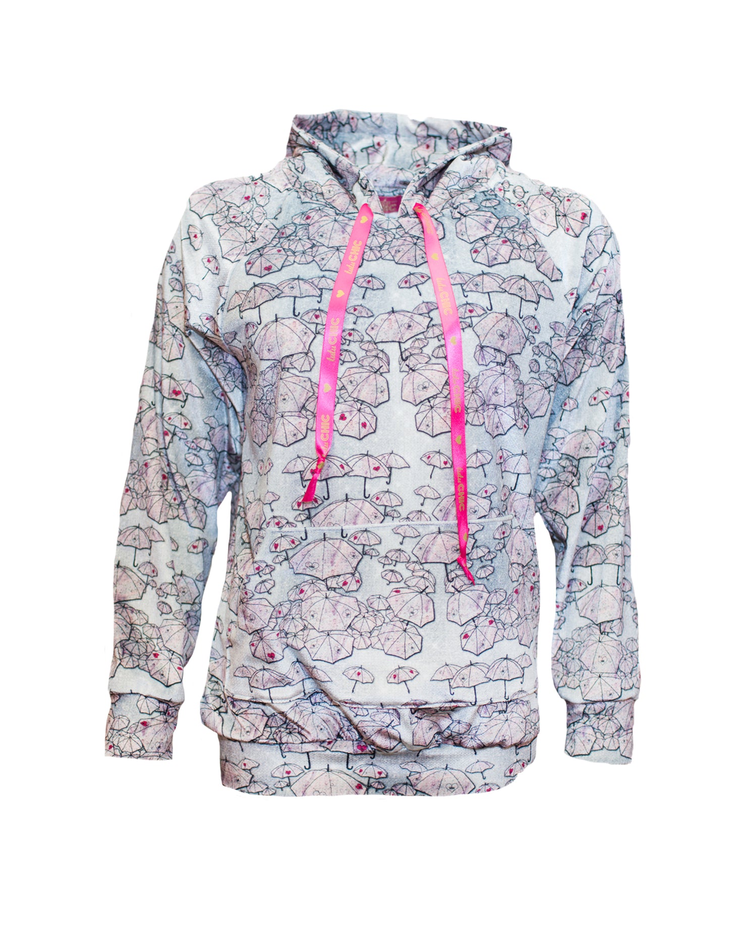 The hoodie is in stretch velvet, a lovely material printed with our own print of little umbrellas, Tutu Chic hearts and raindrops.