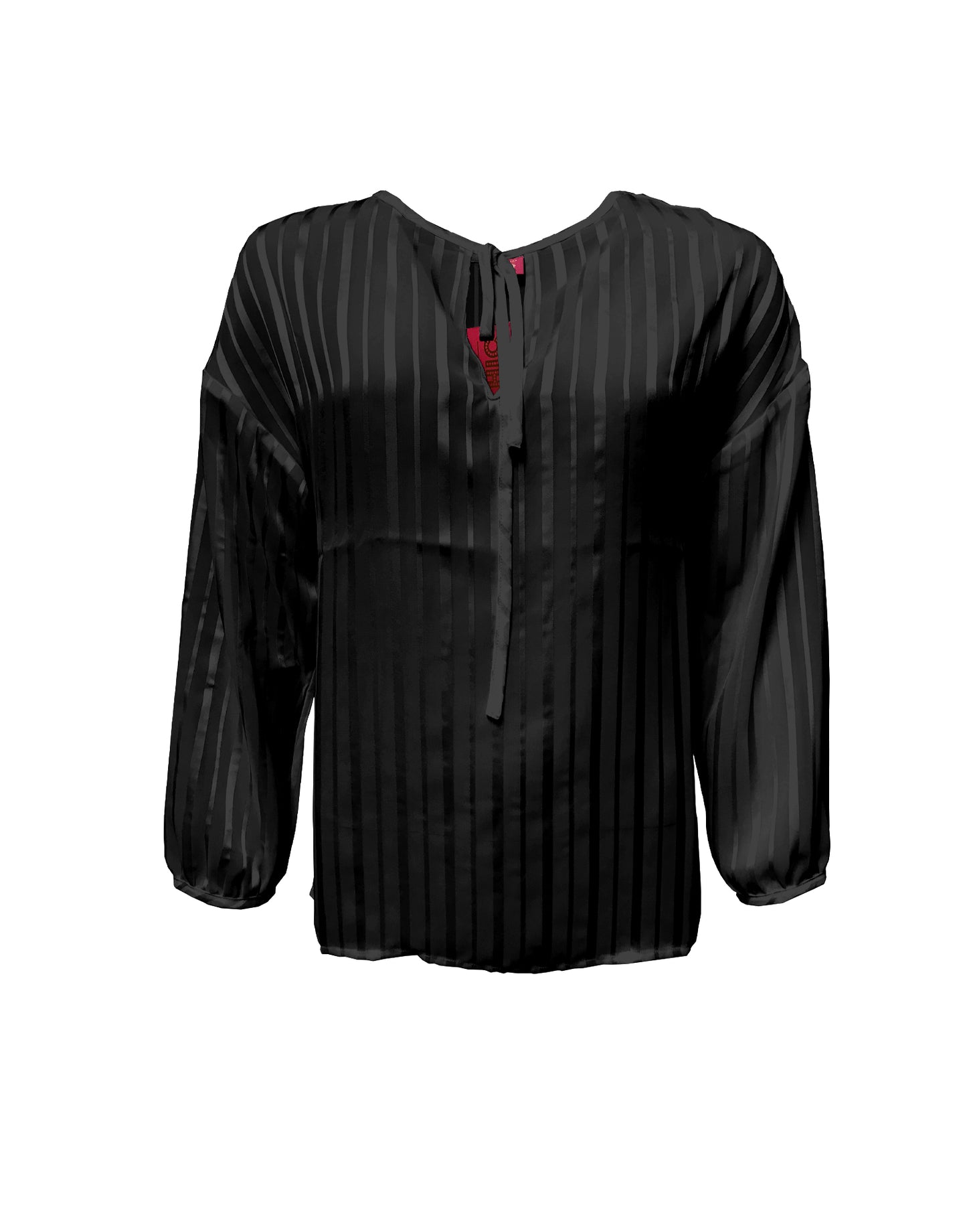 Be effortlessly stylish with the Sapo Blouse Black, the essential blouse for any season. Versatile and chic, this must-have piece pairs perfectly with skirts and pants of all styles. Its semi-transparent fabric and unique neckline with two adjustable strings add a touch of playfulness to any outfit. Let loose for a carefree look or tie it up for a more polished appearance. Made from 100% PES, this blouse is a wardrobe staple.